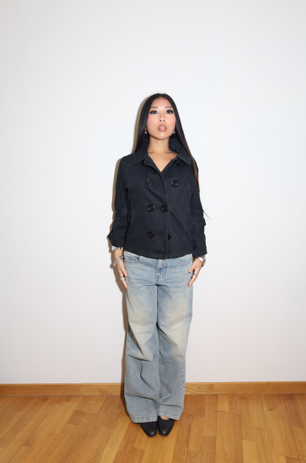 Details: Double-breasted front, collar neckline, wide sleeves with buckle detail
